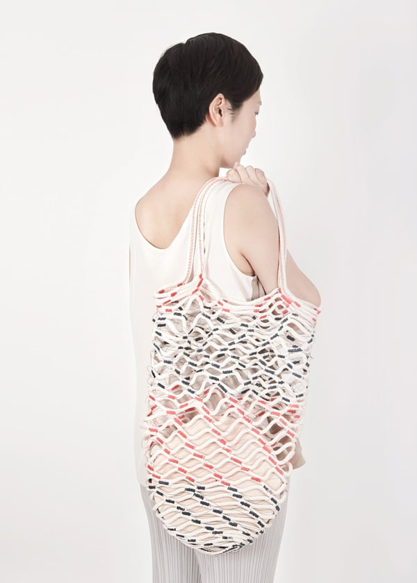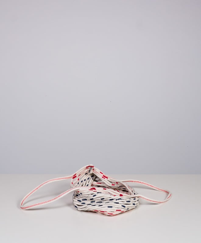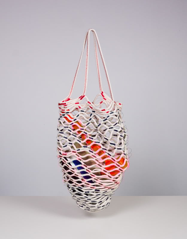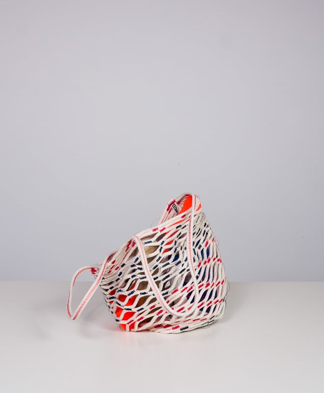 The net bag is a super-strong carrier that expands from a small wad to a full-size tote. It is made from 100% cotton #7 cord and heavy duty, abraision-resistant thread, with two 22" long straps. The variation of the stitching and net pattern make for a visually rich texture that is unique from piece to piece. All materials are manufactured in the USA.